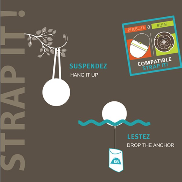 The Kit Strap It in Smart and Green is a system that allows you to attach luminaires Smart and Green, to suspend a tree or a beam but also to float on the water through a cord, mounting hooks and a bag to lester.
