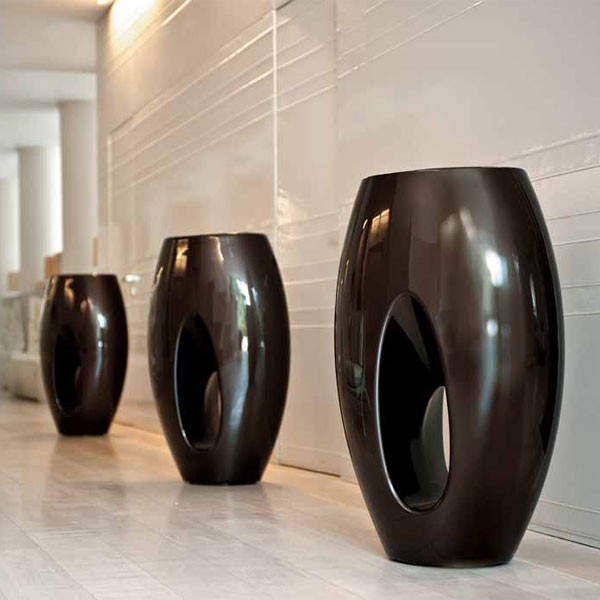 Pot Kadabra in 21st LIVING ART Pot realized in polyethylene Designed for outdoor and indoor Available in 2 sizes: Medium: L total 43 cm x width 29 cm x H 71 cm (container: L16, 5cm x H25cm) Tall: L total 60.5 cm x width 40 cm x H101cm (container: L23, 5cm x H35cm) Available in 9 colours lacquered: white, black, cream, red, bronze, Plum, chocolate, grey blue metallic and pink charm (light purple)