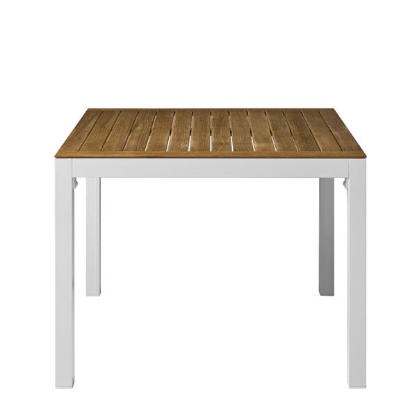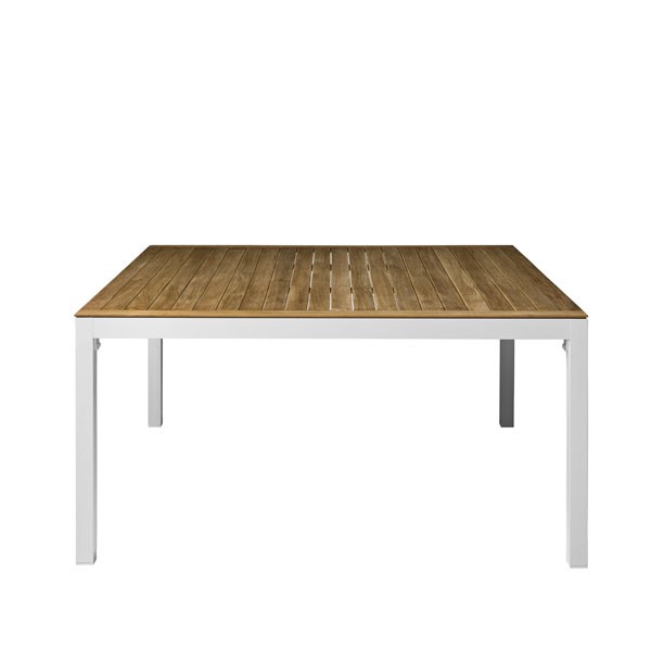 Frame in white lacquered aluminium and shelf in white lacquered aluminium or slats in solid teak wood, this dining table is made from materials resistant which give it the strength required to settle safely outdoors.